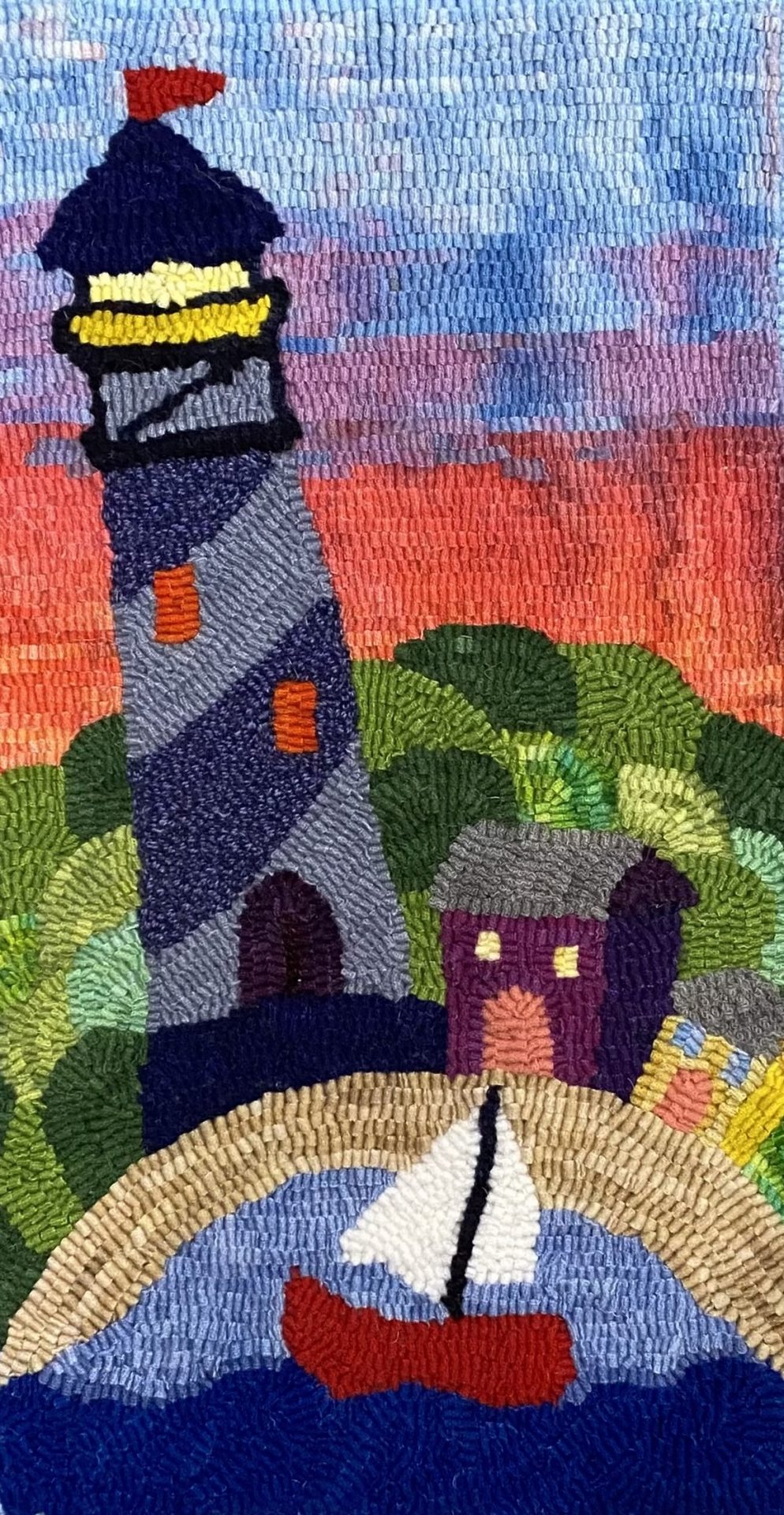 “East Coast Funky Lighthouse” is a whimsical rug hooking pattern that brings coastal charm to any space! Perched on an imaginative cliff, this quirky lighthouse stands tall with its keeper’s house and shed nestled close by, while a sailboat playfully bobs in the water below. Whether it’s for a cozy cottage, a lively downtown office, or a formal living room, this design fits anywhere people and good times gather. Measuring 10 x 18 inches on 100% linen, it’s drawn with sharp, crisp lines for accuracy and ease of hooking. Let your creativity shine with this fun maritime-inspired pattern!